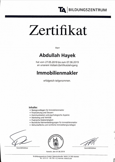 2019 absolvierte ich den IHK-Lehrgang zum zertifizierten Immobilienmakler (100 Unterrichtsstunden). Im selben Jahr schloss ich mein Geschäft, um mein Fachabitur nachzuholen – mit Abschluss im Juli 2021.