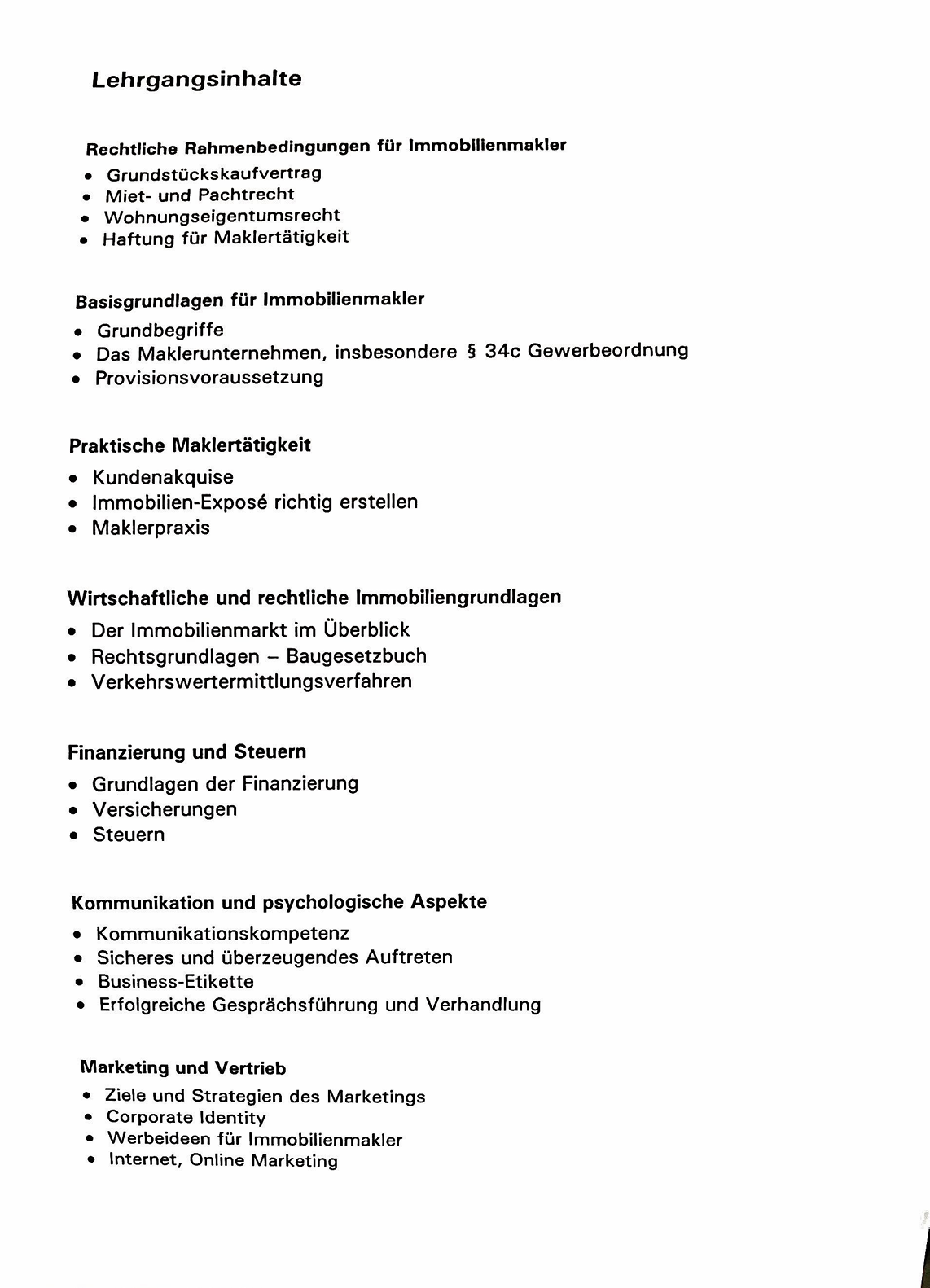 Zertifizierter Immobilienmakler (IHK), Lehrgangsdauer: 100 Unterrichtsstunden (2019). Inhalte u. a. rechtliche Rahmenbedingungen, Finanzierung, Kommunikation, Marketing & Vertrieb.